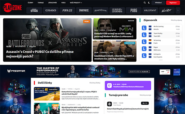 The largest esports portal in the Czech Republic and Slovakia with more than 300,000 registered users. It reaches 250,000 unique readers every month and has a social media reach of 2,500,000 users. Around 300 tournaments are held on PLAYzone.cz every year.