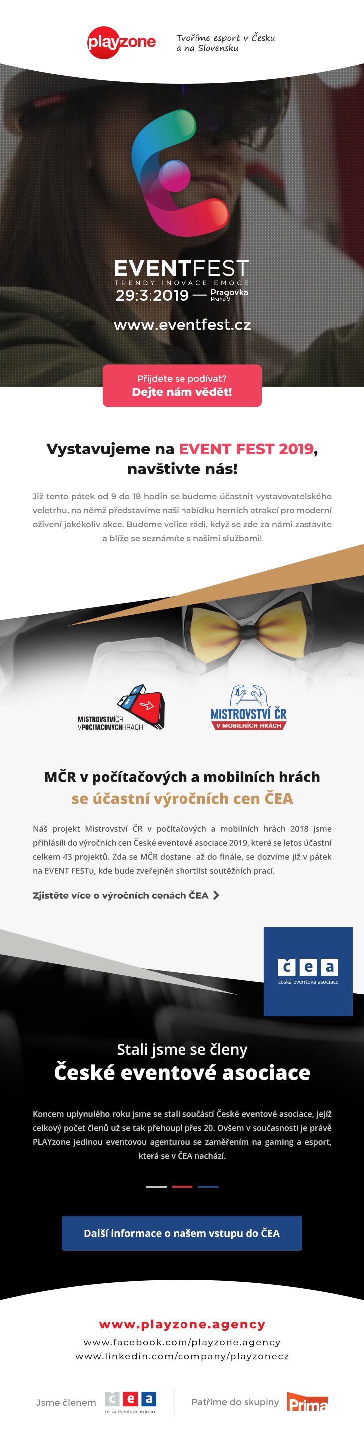Vážení partneři a fanoušci naší agentury, rádi bychom Vás tímto informovali o našem aktuálním dění, konkrétně našich aktivitách kolem České eventové asociace a pak Vás pozvali na vystavovatelský veletrh EVENT FEST 2019, kde můžete navštívit i PLAYzone.