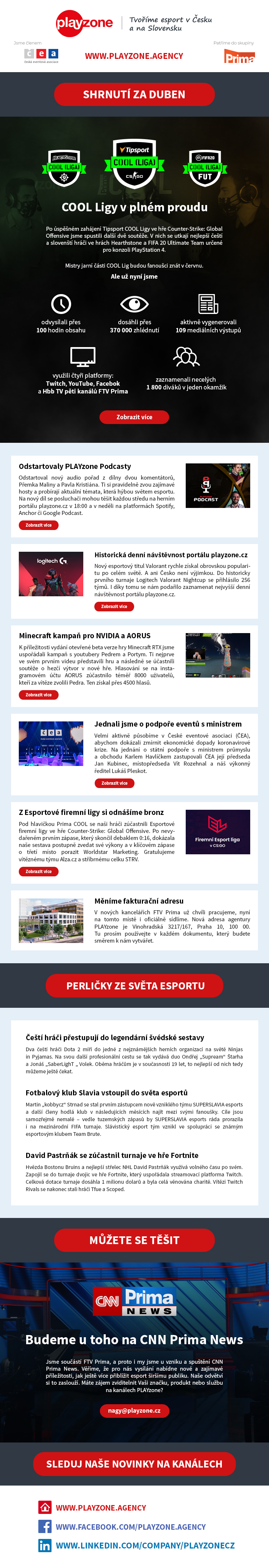 Shrnutí dubnových aktivit agentury PLAYzone Vážení fanoušci esportu a obchodní partneři, rádi bychom Vám prezentovali aktivity naší agentury za měsíc duben.