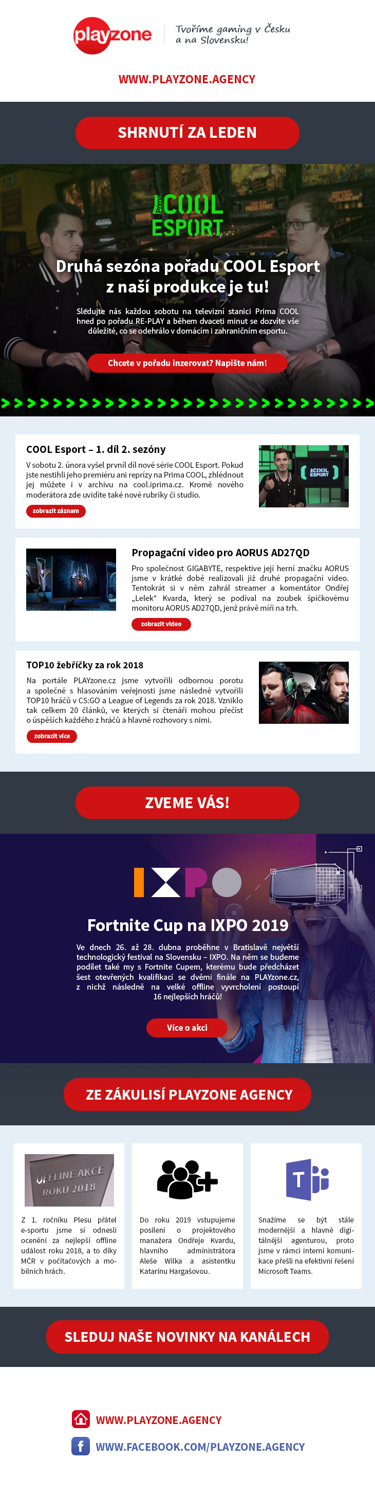 Shrnutí lednových aktivit agentury PLAYzone Dovolujeme si vás pomocí stručného shrnutí informovat o našich nejdůležitějších lednových aktivitách.