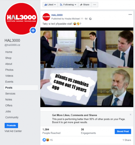 Pro společnost 100mega již několik let spravujeme facebookovou stránku výrobce herních a kancelářských počítačů HAL3000. Stránku jsme pomáhali založit a rozjet, nyní pro ni na denní bázi dodáváme obsah s herní, esportovou a zábavnou tématikou jako doprovodný content produktové komunikace klienta. Stránka klienta: https://www.facebook.com/pg/hal3000.cz/ |